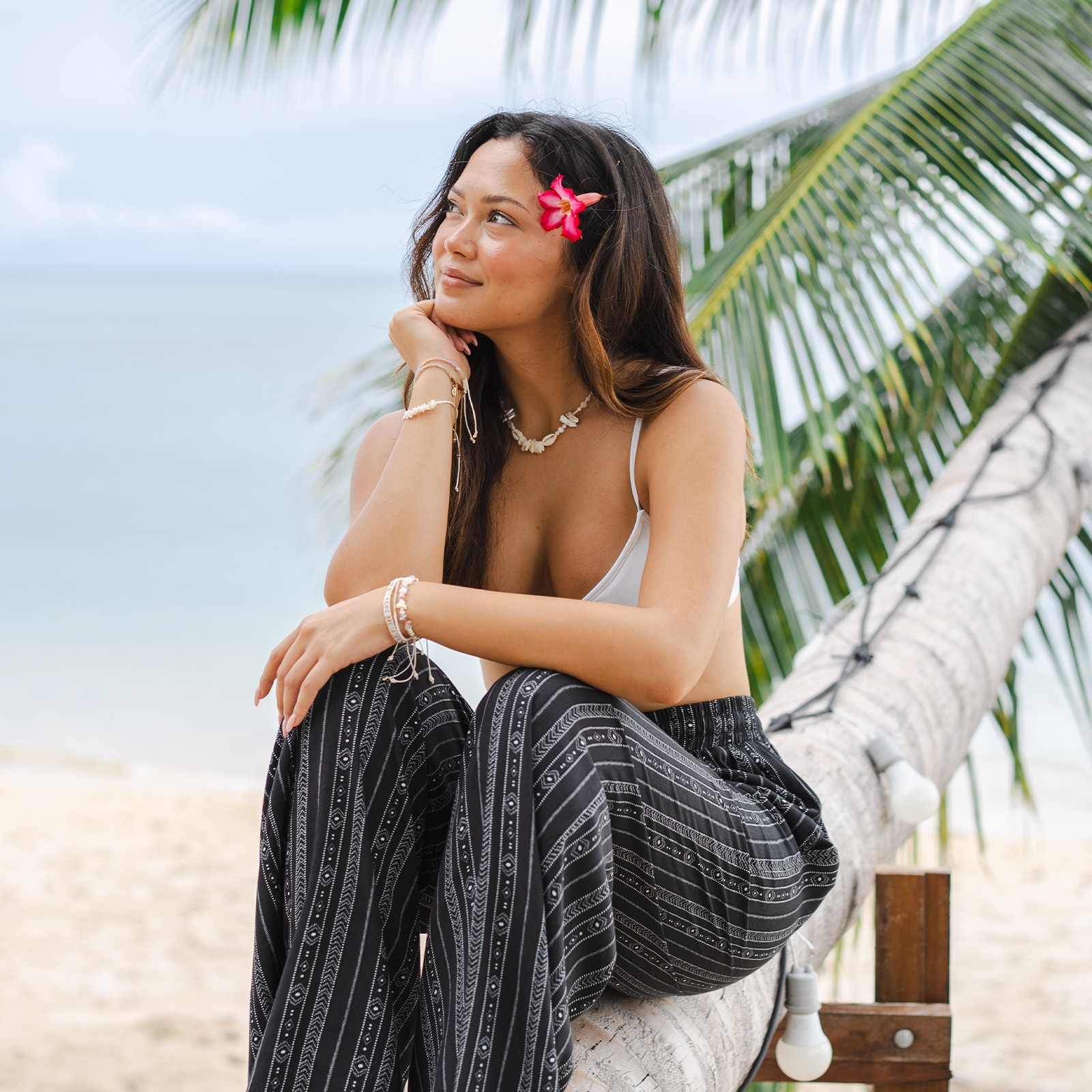 The perfect pair of loose, flowy yoga pants. Everyone is switching from their tight, restrictive yoga pants to these! Wear them to yoga, the beach, or girl's night in! Pair them with a bikini top, body suit, or cropped tee for maximum style, comfort, and all the turning heads. Incredibly soft and lightweight, an elastic waist and cinched leg are perfect for relaxation and movement.