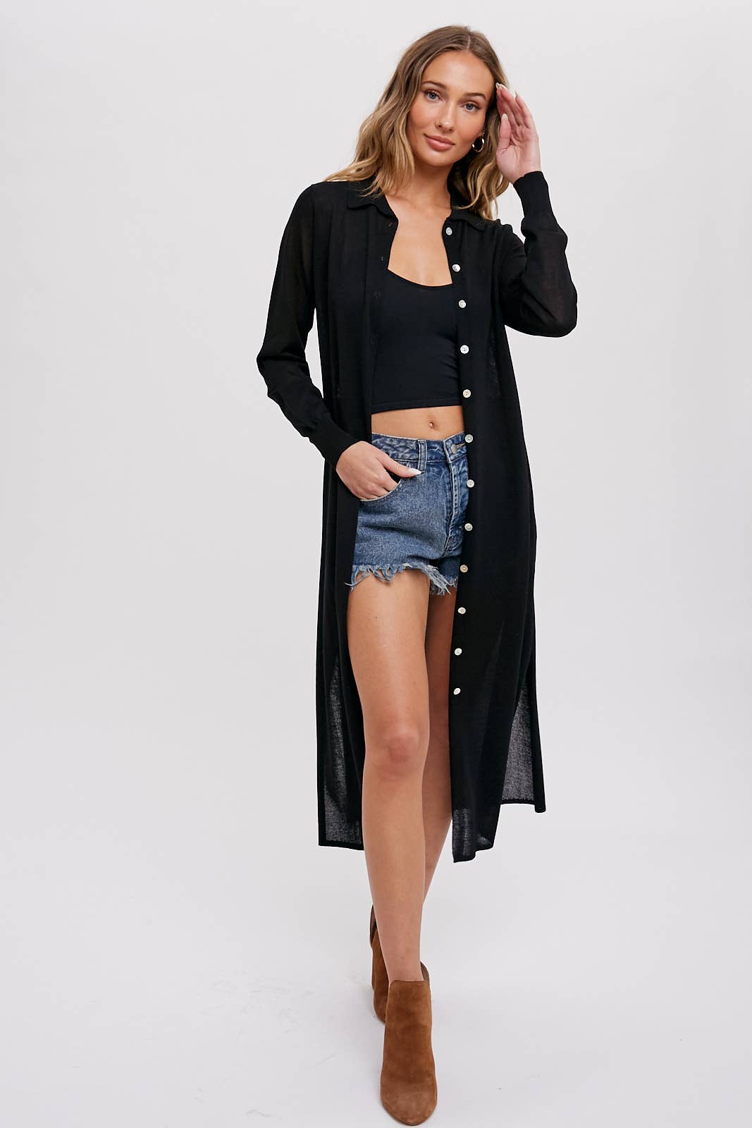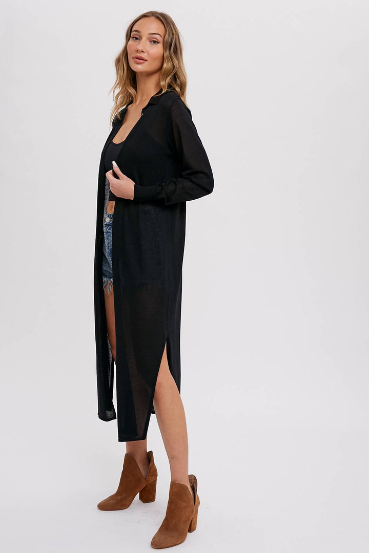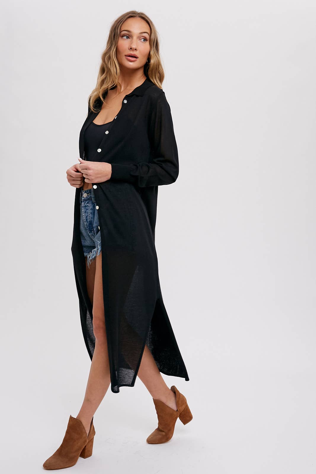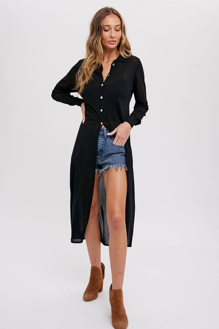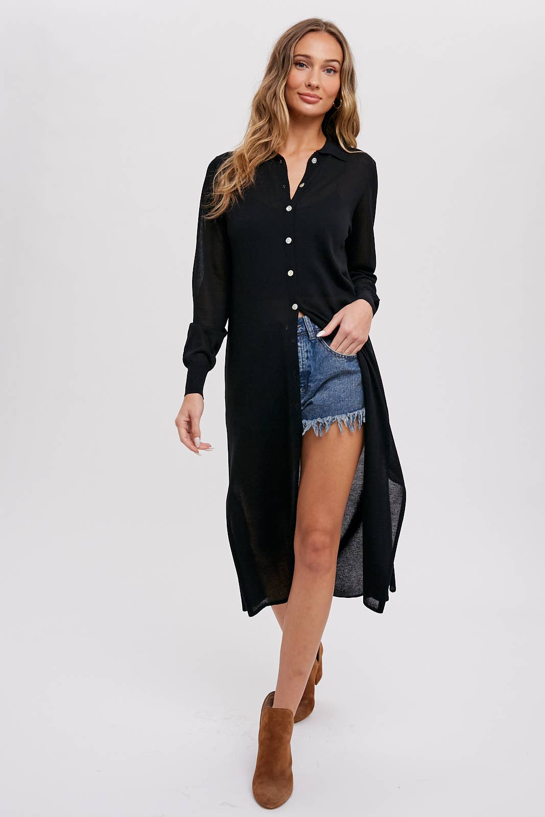 Lightweight knit shirt top featuring a button-down front, long sleeves, longline length, side slits. Wear it alone as a cozy plaid shirt or layer over your favorite top as a cute duster.