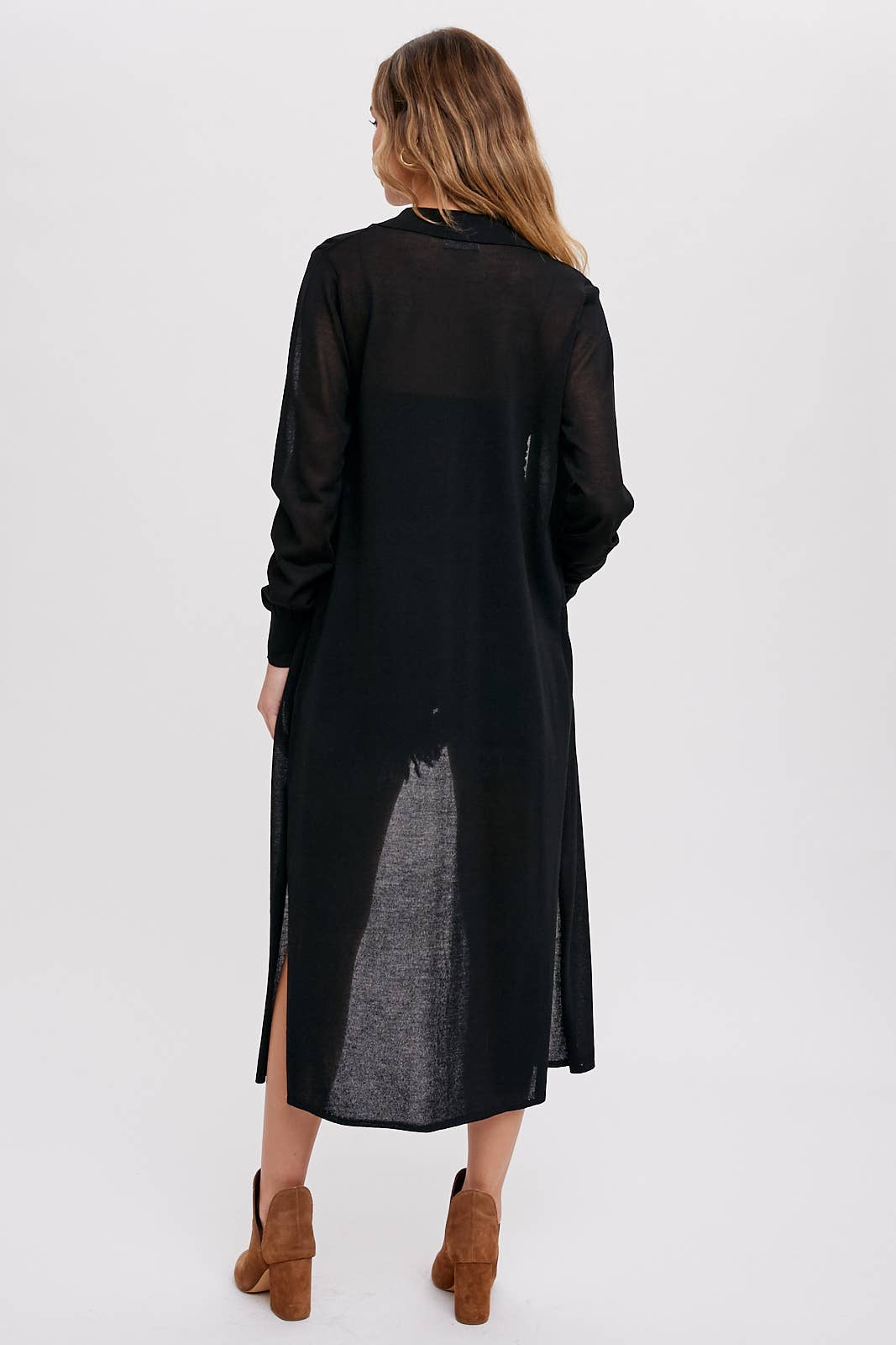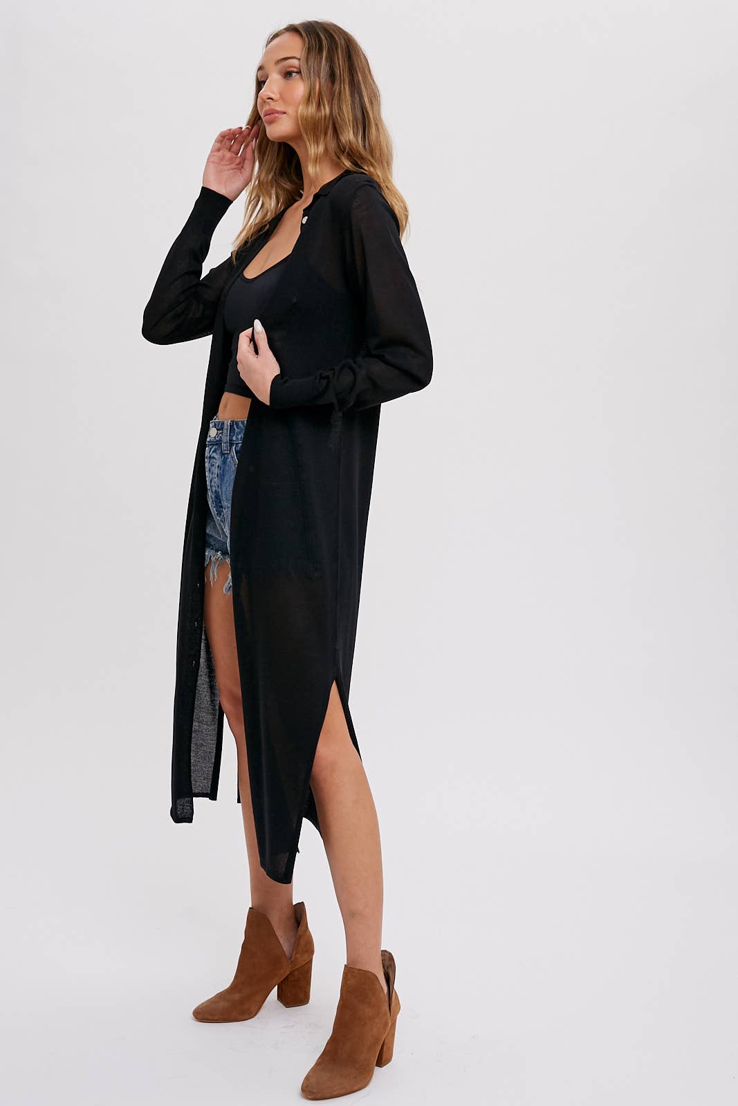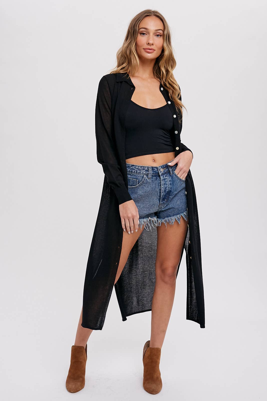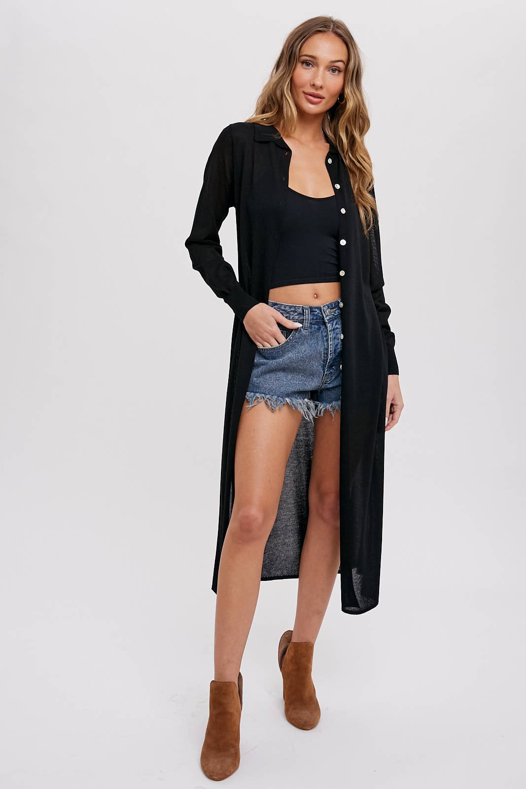 Lightweight knit shirt top featuring a button-down front, long sleeves, longline length, side slits. Wear it alone as a cozy plaid shirt or layer over your favorite top as a cute duster.