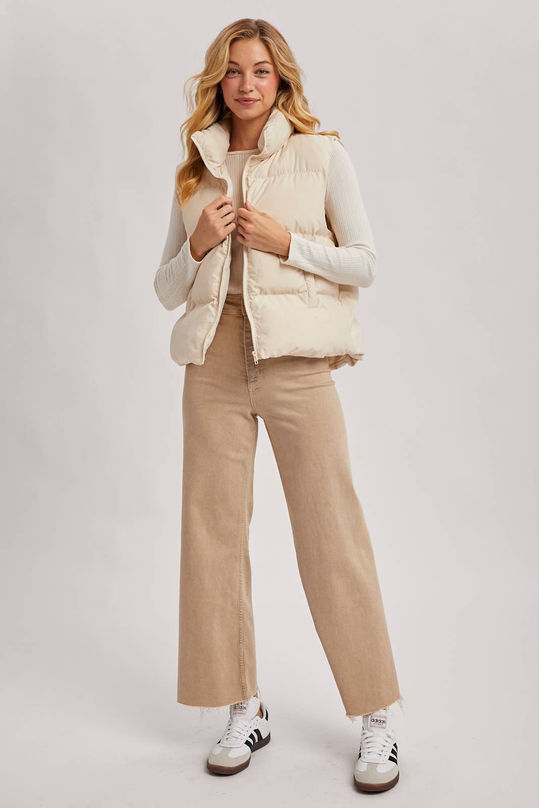 Zipper front puffer vest with pockets. This practical and stylish vest features a front zipper closure and convenient pockets, making it perfect for layering. The puffer design provides warmth and comfort, while the sleek silhouette ensures a modern look. Ideal for chilly days, this versatile vest can be worn over sweaters, hoodies, or long-sleeve shirts for added warmth and style. -Model is 5'9" and wearing a Small