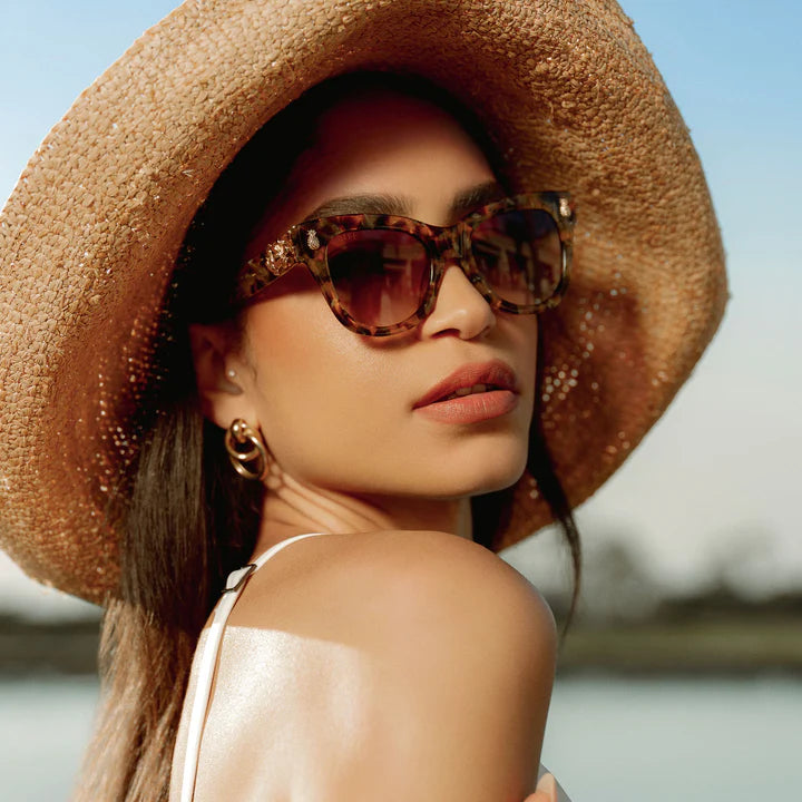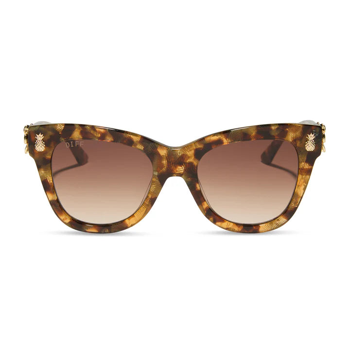 Escape to the tropics - the sophisticated way with sleek acetate frames reminiscent of duty-free indulgences, sweet drinks, and intriguing secrets. Golden plumeria clusters and a pineapple accent provide the perfect elevated tropical touches. From sunkissed beaches to a resort bar rendezvous, these shades stay sleek, chic, and utterly alluring.