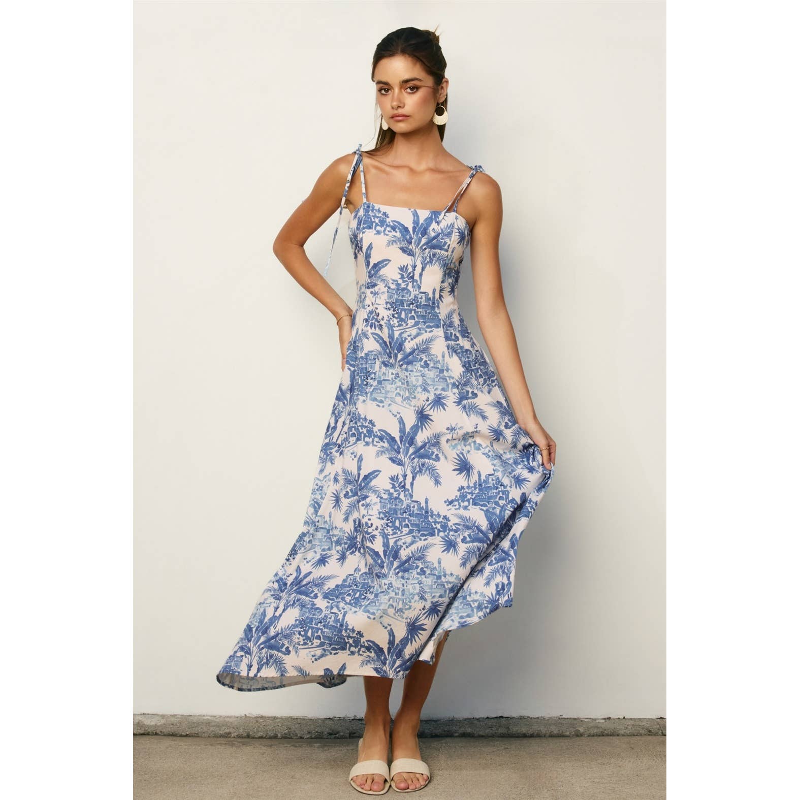 This Dress Forum midi dress combines comfort and style with its thoughtfully designed silhouette. The conversational print cotton-rayon blend drapes beautifully while the adjustable tie shoulder straps offer a customizable fit. A square neckline and princess seaming create flattering lines, while the smocked back panel adds subtle texture and movement. The center back invisible zipper ensures a seamless look, and partial lining through the bodice and lower section provides coverage where it matters. Perfect for warm-weather occasions, this piece balances breathability with refined construction.