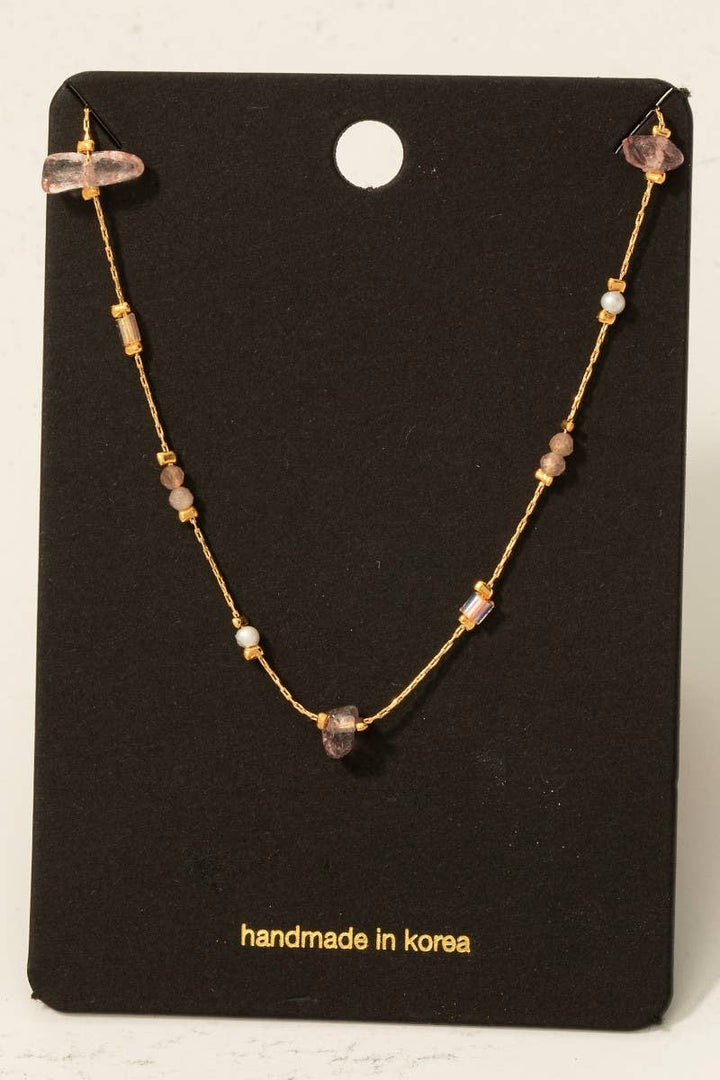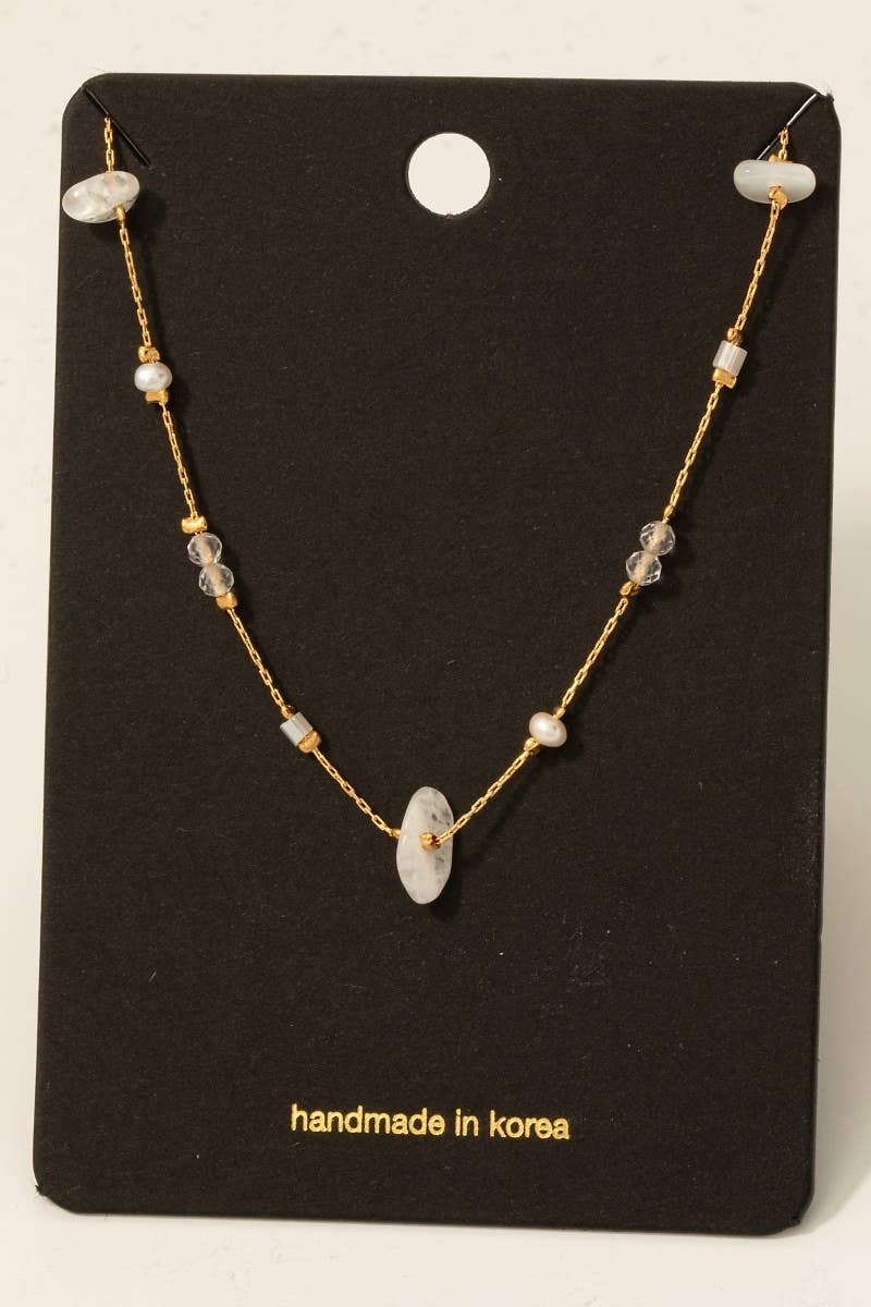 This chain necklace showcases a unique pearl and chip stone station beads style. Elevate your ensemble with this chic, timeless chain necklace.