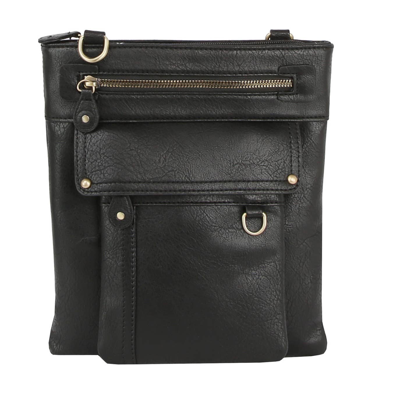 Crafted with a secure top zip closure and finished in gleaming gold-tone hardware, this crossbody handbag combines practical design with polished aesthetics. The solid interior lining features a dedicated pocket for essentials, while the detachable strap offers versatile styling—wear it crossbody for hands-free convenience or remove it entirely. Constructed in durable PVC, it's built to withstand daily wear while maintaining its refined appearance.