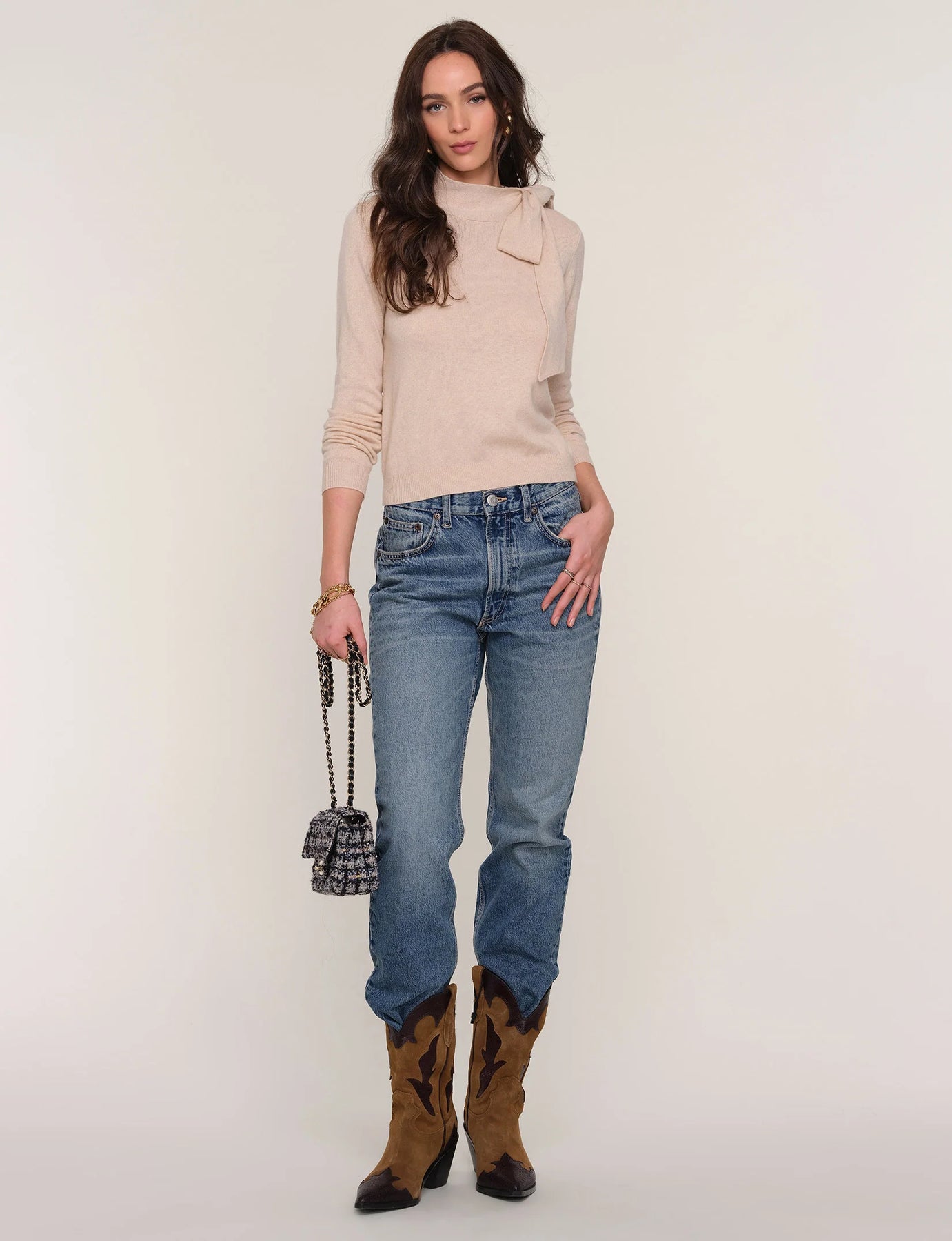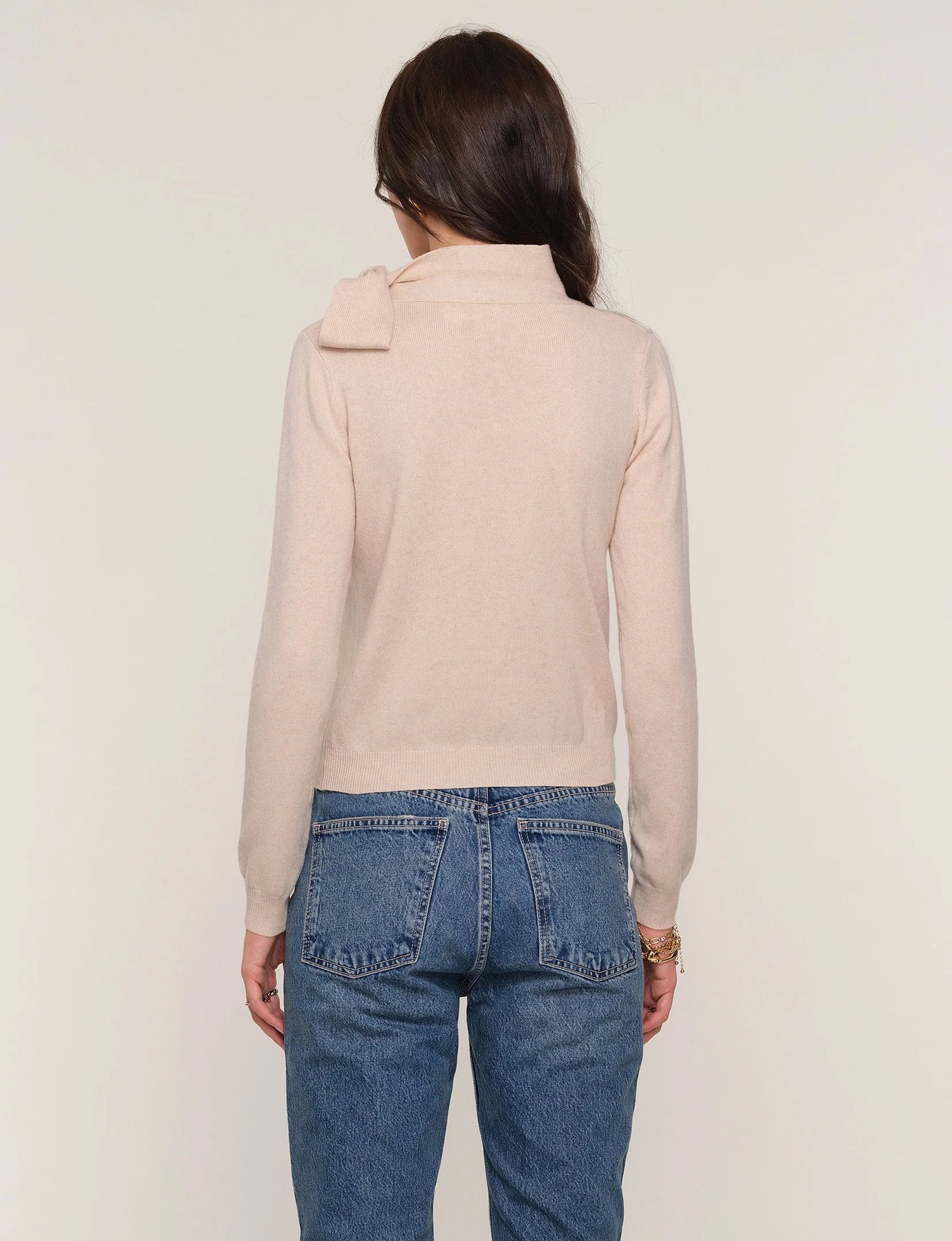 The Lissa Sweater is a relaxed fit sweater. Made from a cashmere blend it features a mock neck that ties into a bow