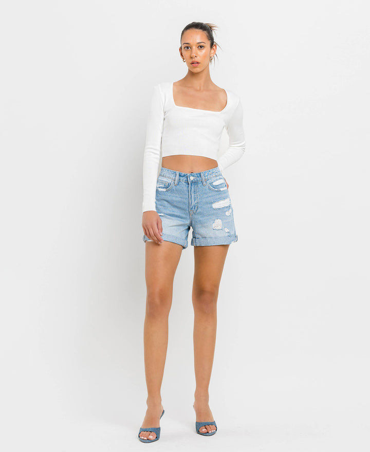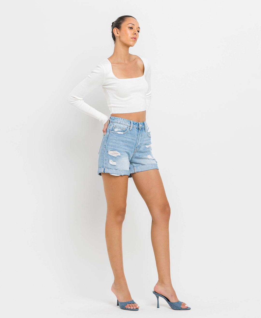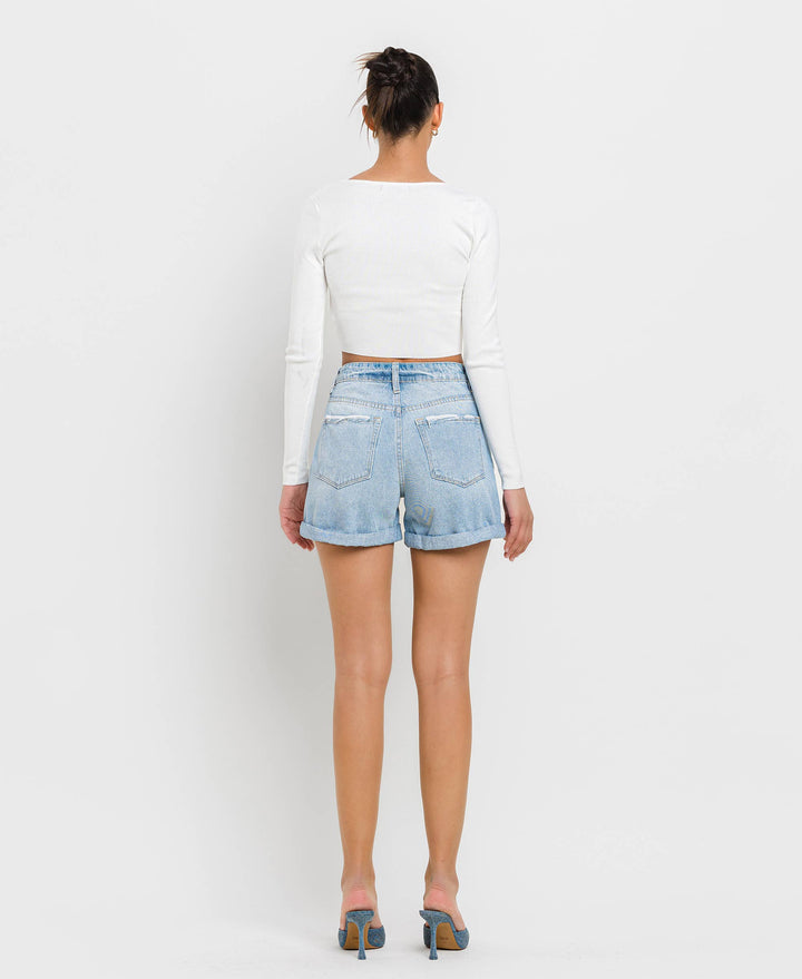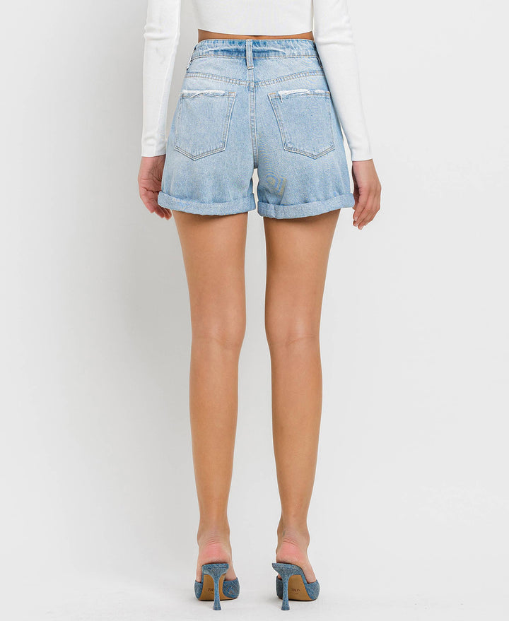 These mid-rise boyfriend shorts feature a non-stretch denim fabric with a double cuffed hem and distressed accents, offering a relaxed yet polished look. Designed with a mid-rise waist, they combine classic style with contemporary detailing for versatile wear.