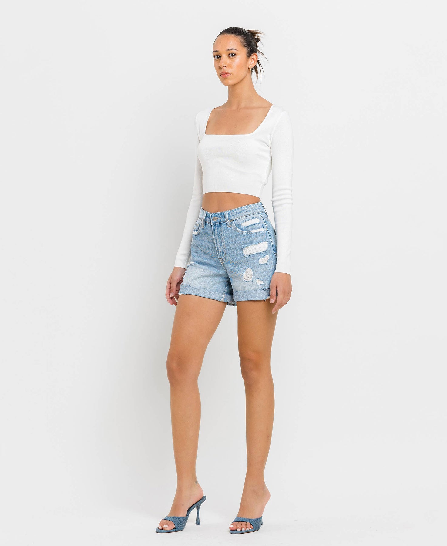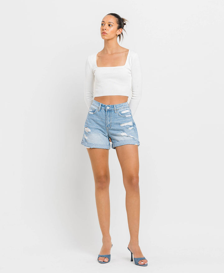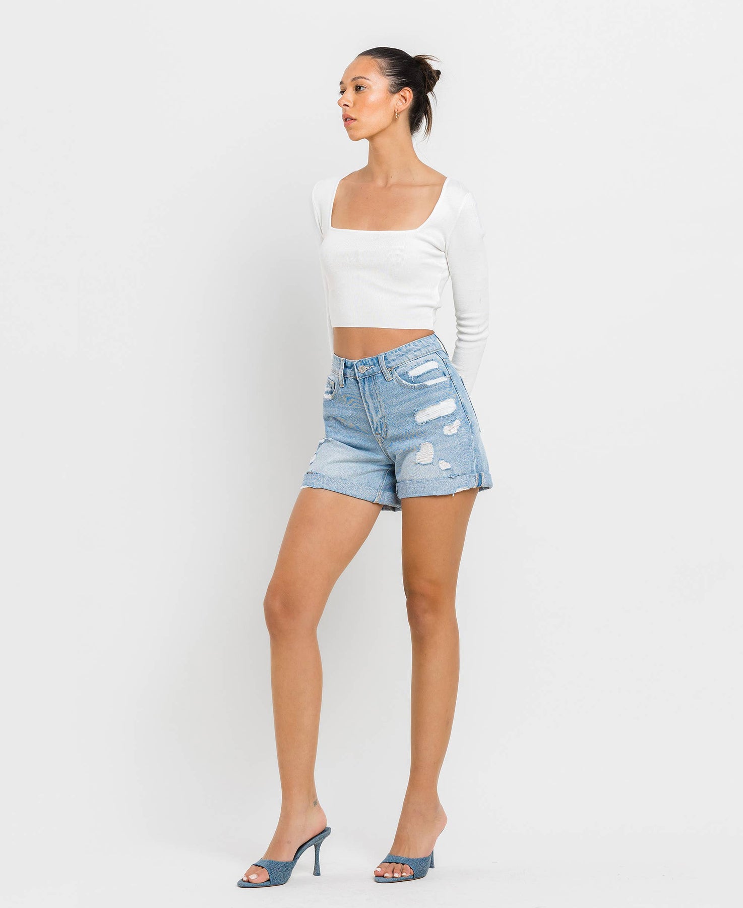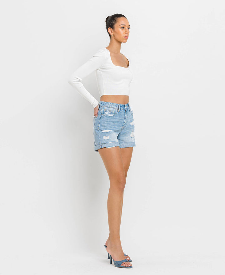 These mid-rise boyfriend shorts feature a non-stretch denim fabric with a double cuffed hem and distressed accents, offering a relaxed yet polished look. Designed with a mid-rise waist, they combine classic style with contemporary detailing for versatile wear.