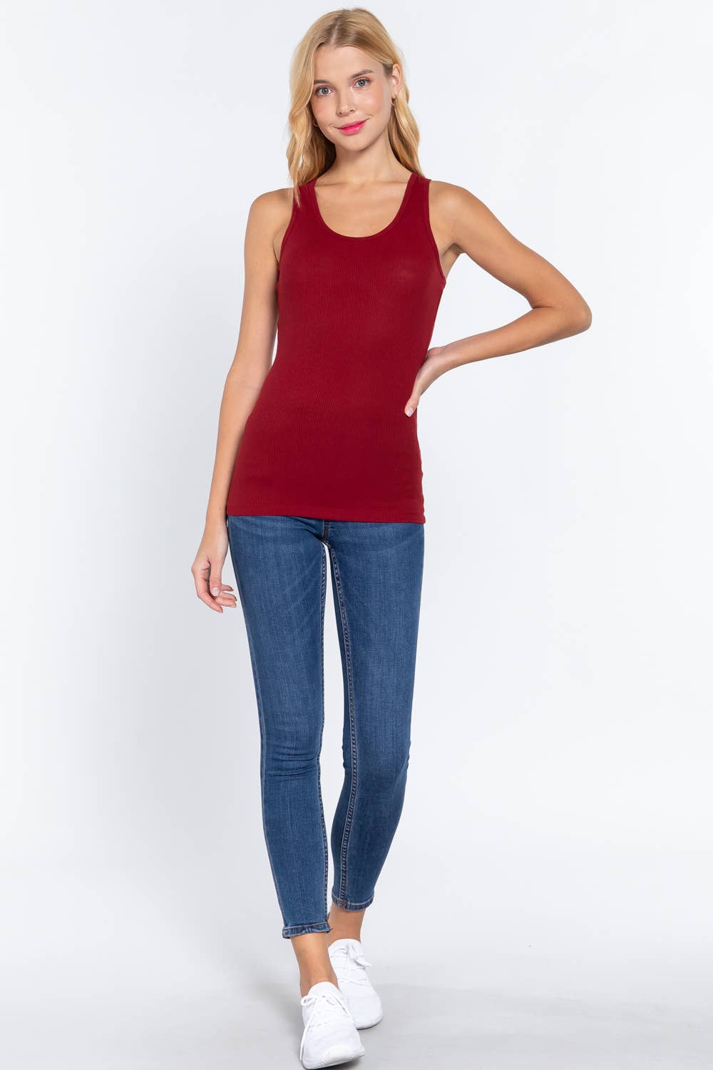 This racerback tank top is crafted from a ribbed blend of cotton, polyester, and spandex, offering both comfort and flexibility.