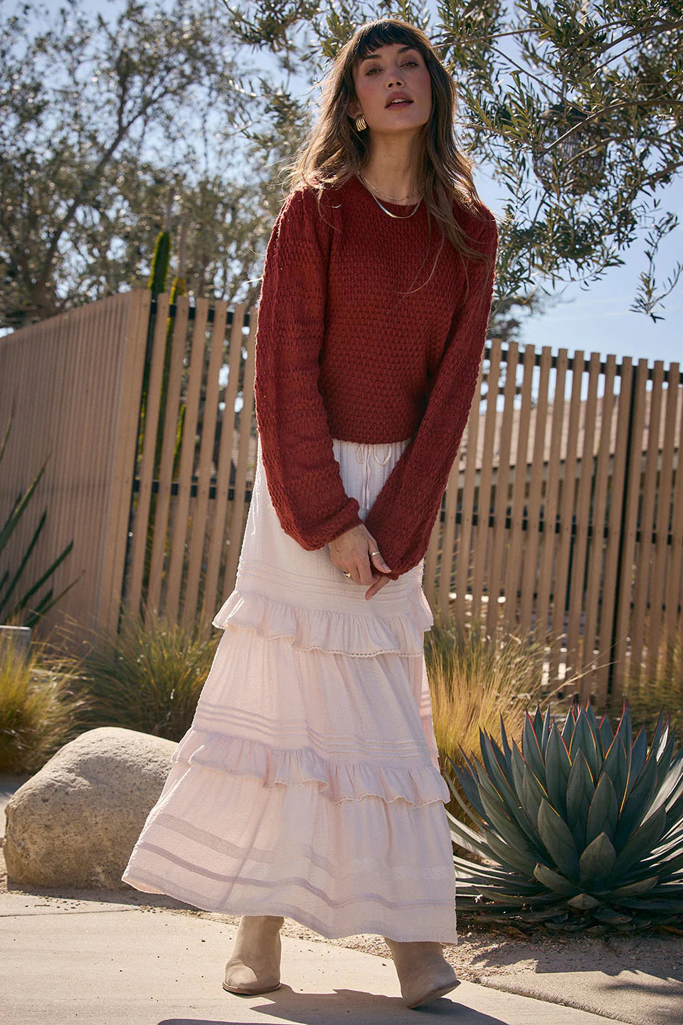 The Regan Midi Skirt offers a sweet silhouette with tiered ruffled hems and a full skirt that gracefully flutters with every stride.