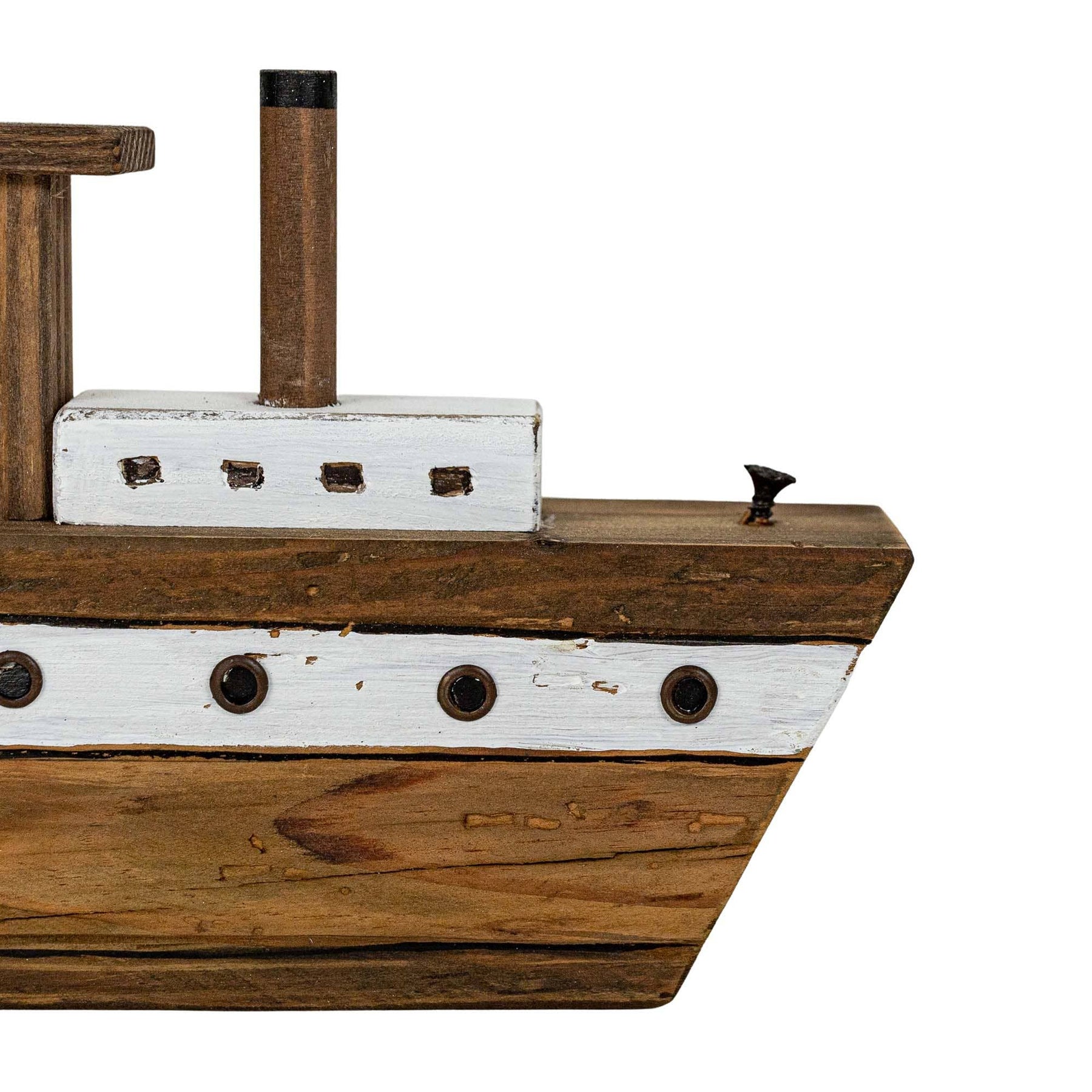 This charming tugboat inspired decorative accent is the perfect addition to any home. Crafted from natural wood, this piece features white accents that give it a classic coastal style. Perfect for a mantel or tabletop, this traditional style decor piece will bring a touch of nautical charm to your space. With its timeless design, this decorative object is sure to be a conversation starter. -Size is perfect for accenting a mantel or side table, or adorning shelves and built ins. -A clean aesthetic is created by layering tones of natural wood and white elements to bring out details of the ship accent. -Suited for traditional and coastal decor styles. -Material: Wood & Metal -Perfect For: Traditional Decor, Coastal Decor, Coastal Home Decor, Nautical Decor, Lake Decor, Lake Life, Decorative Accent, Decorative Accessories, Home Decor Accents, Gift Shop Items, Small Gifts, Home Gifts